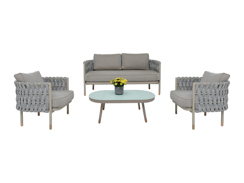 | Đặc điểm kỹ thuật | khung nhôm có dệt dây, tổng cộng 4 chiếc; Ghế yêu: L73*W141*H63cm, 1 ghế đơn: L73*W75*H63cm, 2 bàn cà phê: L100*W50*H38cm, kính trắng cường lực 5mm, 1PC |