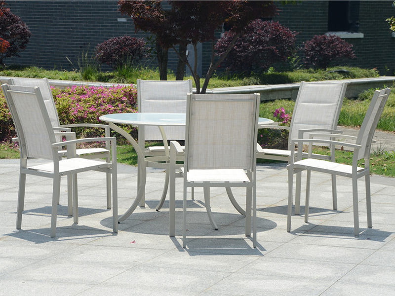 | bàn:φ130xH72cm,nhôm,kính trắng cường lực 5mm không có lỗ dù, vít mạ kẽm; ghế:L64.5×W57×H96cm, khung nhôm và ống đỡ lưng bằng thép, vải dệt đôi 2×1 có chứa sợi bên trong | 133×7×133CM/một bàn trong thùng carton; 31 chiếc ghế/pallet | 165 BỘ |